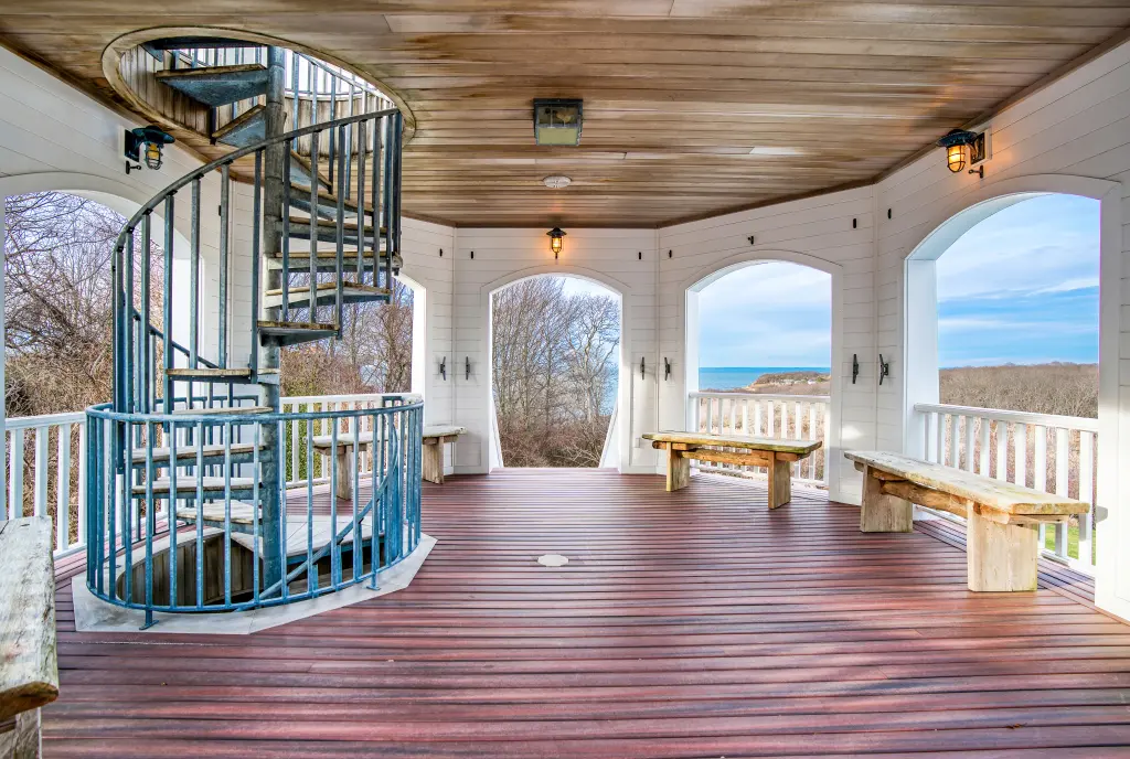 Built in 2008, the home features myriad indoor/outdoor living spaces and these spiraling stairs.